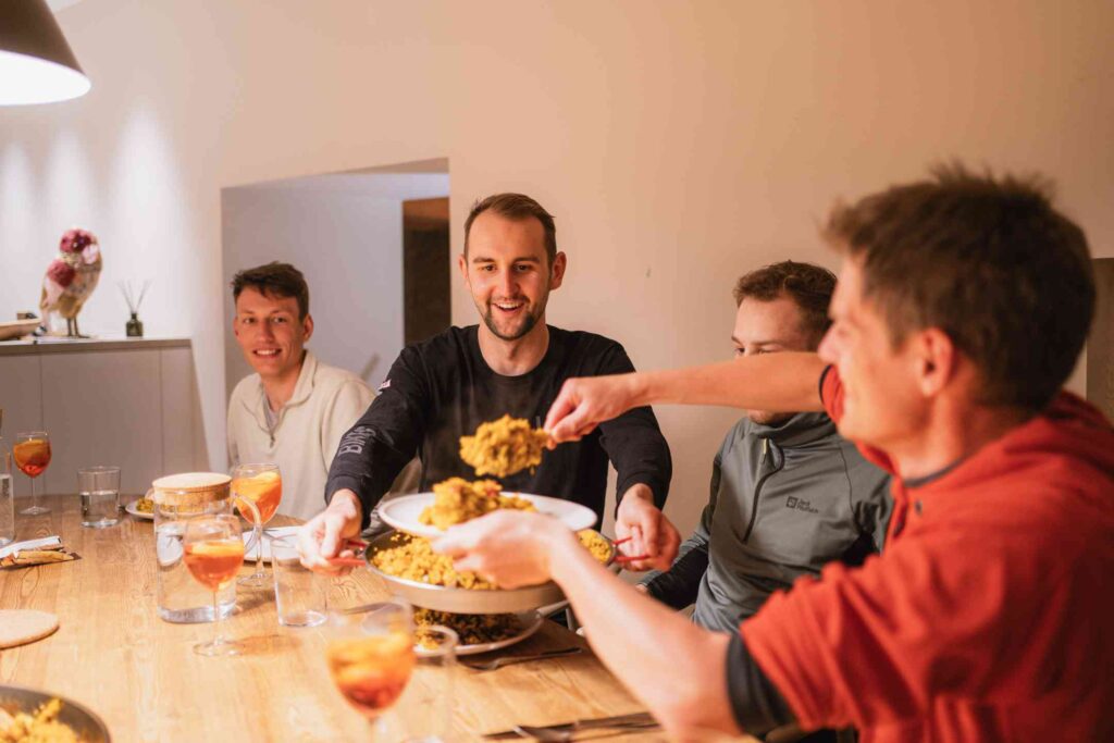 Der Garten wurde bereits am ersten Tag in Beschlag genommen: Fahrräder wurden gecheckt, Laufräder getauscht, Ketten geölt. Drinnen stapelten sich Nudeln, Gemüse, Kaffee und Energieriegel – alles, was man für eine sportliche Woche braucht. Die große Küche war gleichzeitig auch Wohnzimmer, Treffpunkt und Besprechungsraum.